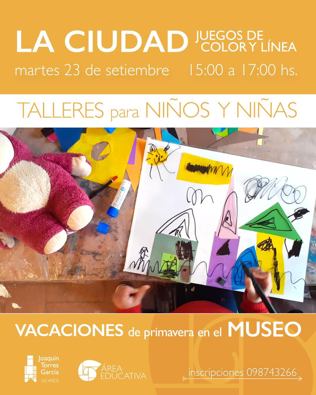 ▪️Martes 23 de setiembre taller “La ciudad; juegos de color y linea”. En base al tema de la ciudad tan presente en la obra de Torres y su periplo viviendo en diferentes ciudades del mundo, tomaremos inspiración para pensar y crear nuestras propias ciudades. Usaremos planos de color, formas y jugando con las lineas daremos vida a estos espacios imaginarios y reales.